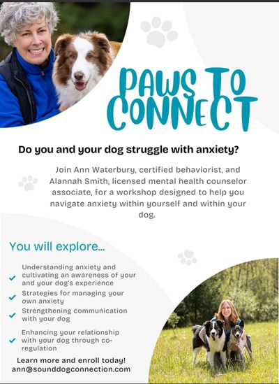 Do you and your dog struggle with anxiety? Join Ann Waterbury, certified behaviorist, and Alannah Smith, licensed mental health counselor associate, for a workshop designed to help you navigate anxiety within yourself and your dog.